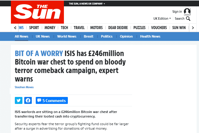وقالت ذا صن:إذا تم إثبات الأمر، فستكون داعش أول مجموعة إرهابية تتم مقاضاتها في المحاكم بسبب أنشطتها في العملة المشفرة واستخدامها في العمليات الإرهابية.