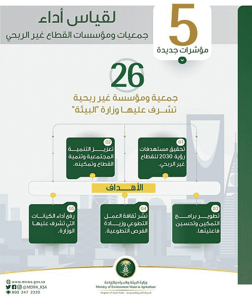 اعتمدت وزارة البيئة والمياه والزراعة، بالتعاون مع وزارة الموارد البشرية والتنمية الاجتماعية، والمركز الوطني لقياس أداء الأجهزة العامة، خمسة مؤشرات تهدف إلى قياس أداء جمعيات ومؤسسات القطاع غير الربحي التي تشرف عليها الوزارة.
