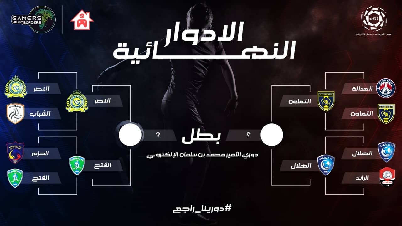 تأهلت أندية الهلال والتعاون والنصر والفتح للدور نصف النهائي من دوري الأمير محمد بن سلمان الإلكتروني ضمن فعاليات الحدث الرياضي الإلكتروني الخيري (لاعبون بلا حدود).