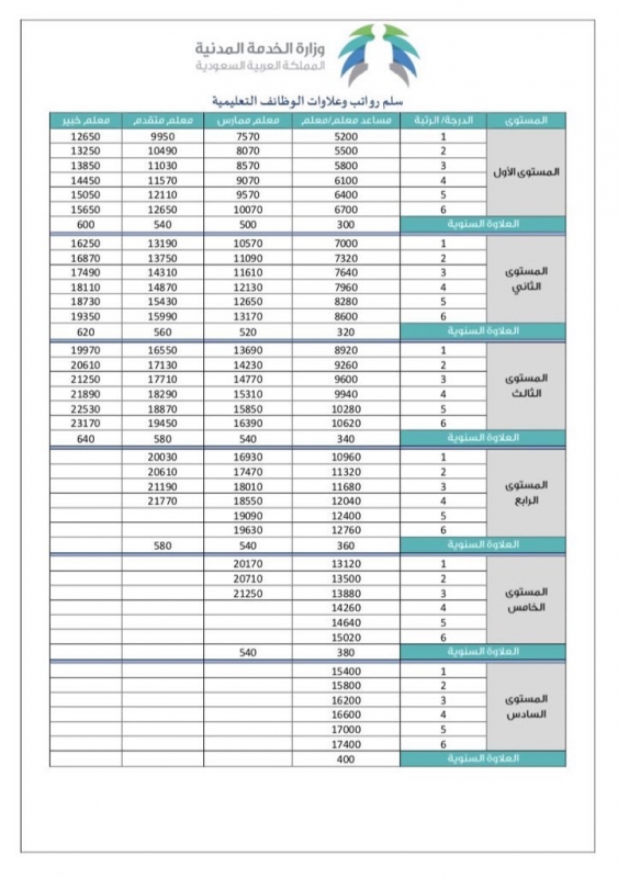 وترتفع قيمة العلاوة السنوية بحسب المستوى الوظيفي حتى تصل إلى 400 ريال للمعلم المساعد في المستوى السادس فيما تصل علاوة المعلم الخبير في المستوى الثالث إلى 640 ريالًا وهو أعلى قيمة للعلاوة السنوية وفق السلم الجديد.