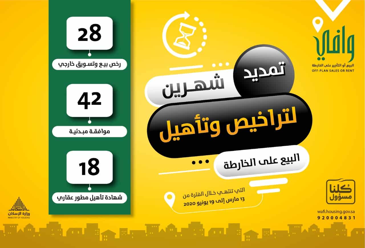 يذكر أن برنامج البيع والتأجير على الخارطة “وافي” التابع لوزارة الإسكان، يعمل على تنظيم نشاط بيع أو تأجير الوحدات العقارية مهما كان غرضها أو أسلوب تطويرها قبل أو أثناء مرحلة التطوير أو البناء، ويلزم البرنامج المطورين العقاريين بالتنفيذ وفق الخطة الزمنية لكل مشروع حسب النماذج والمواصفات المعتمدة.