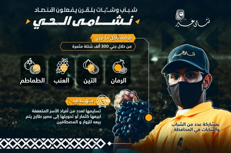 وشارك عدد من الشباب والشابات في المحافظة بالعمل في مزرعة ابن شيبان والتي تحتوي على أكثر من 300 ألف شتلة مثمرة من الفواكه الموسمية تتصدرها الفراولة بأكثر من 160 ألف شتلة، إضافة إلى الرمان والتين والعنب والطماطم، حيث قاموا بتنظيفها، وجني ثمارها، وتنظيمها في عبواتٍ.
