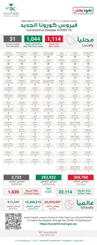 وكانت وزارة الصحة أعلنت عن تسجيل 1114 حالة إصابة جديدة بفيروس كورونا المستجد خلال الـ24 ساعة الماضية، ليرتفع بذلك إجمالي عدد الإصابات بالمملكة إلى 309768 إصابة، وبلغ عدد حالات التعافي 283932 حالة، وبلغ عدد الوفيات 3722 حالة، بينما بلغ عدد الحالات النشطة 22114 حالة، فيما وصل عدد الحالات الحرجة 1639 حالة.