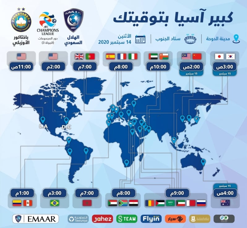 وتُقام مباراة الهلال وباختاكور الأوزبكي على استاد الجنوب في قطر، عند الساعة التاسعة مساء اليوم، ضمن منافسات الجولة الثالثة من مرحلة المجموعات في بطولة دوري أبطال آسيا 2020.