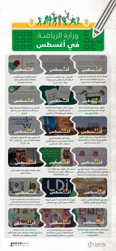 واستكمل: “يوم 22 أغسطس، ولي العهد يوجه بإقامة عدد من سباقات الهجن في السعودية خلال الفترة المقبلة، يوم 25 أغسطس، مجلس الوزراء يوافق على تنظيم نادي سباقات الخيل، وفي اليوم التالي؛ وزير الرياضة يلتقي ممثلي أندية الدرجتين الأولى والثانية، يوم 27، معهد إعداد القادة ينفذ 5 برامج تدريبية لـ3811 مستفيدًا في الشهر”.