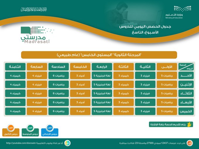 وأيضًا أعلنت عن جدول دروس الحصص اليومية للصفوف (الأول والثاني والثالث المتوسط) من الأسبوع التاسع، عبر قنوات عين على تردد عربسات 12437، في بث مباشر من الساعة 9 صباحًا، ويُعاد طوال اليوم، أو عبر رابط القناة على اليوتيوب: هنا.