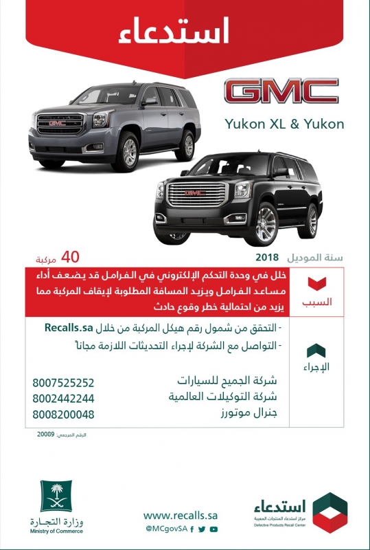 أعلنت وزارة التجارة عن استدعاء 124 مركبة Oncoming automobile كاديلاك “Escalade & Escalade ESV” وOncoming automobile Yukon XL & Yukon / Sierra” GMC” موديل 2018.