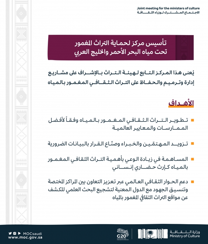 واستعرضت وزارة الثقافة عبر حسابها بموقع تويتر، أبرز أهداف مركز حماية التراث الثقافي المغمور تحت مياه البحر الأحمر والخليج العربي، والذي يعني بالإشراف على مشاريع وإدارة وترميم والحفاظ على التراث الثقافي المغمور بالمياه.