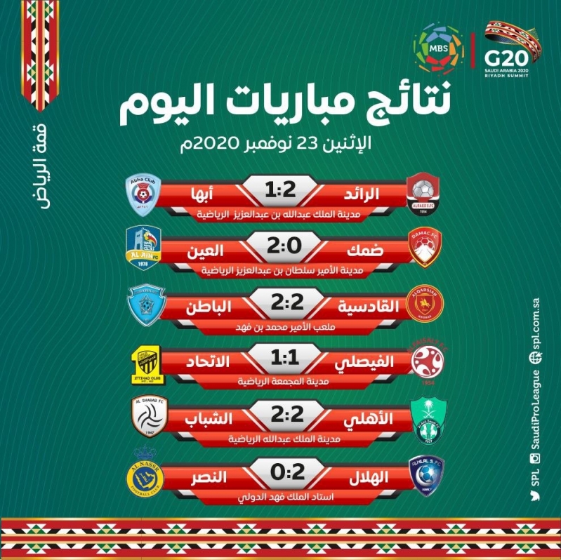 وانطلقت مباريات اليوم في دوري محمد بن سلمان للمحترفين بمواجهة الرائد ضد أبها على ملعب مدينة الملك عبدالله بن عبدالعزيز الرياضية، وتمكن الفريق الريداوي من الفوز بنتيجة 2/ 1، سجلهم أحمد الزين ومحمد فوزير، وأحرز هدف الضيوف كارلوس ستراندبيرغ.