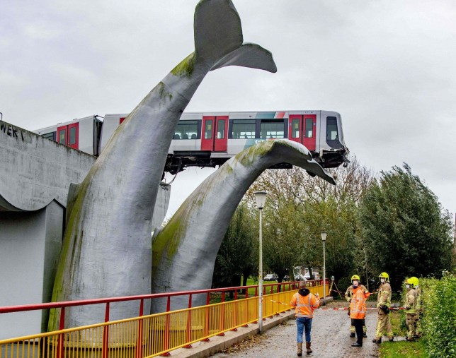 وبحسب صحيفة مترو البريطانية، خرج القطار عن مساره وكان سينتهي به المطاف في المياه أدناه لولا أن منعه ذيل الحوت المعدني العملاق الذي يزين المحطة، ولا تزال العربة معلقة الآن على ارتفاع 10 أمتار فوق ممر للمشاة في محطة مترو مدينة روتردام الهولندية.