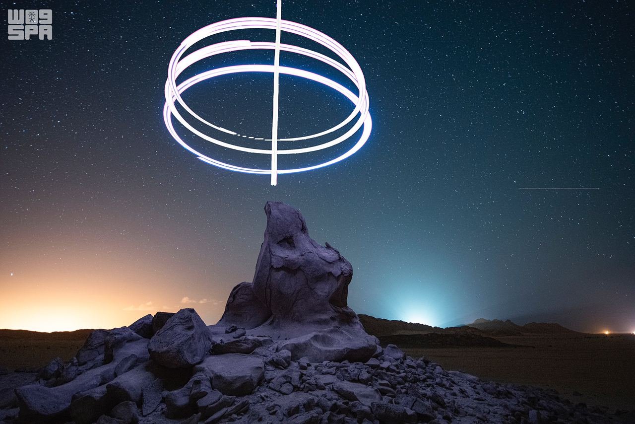 أظهرت لقطات نشرتها وكالة واس، مساء الجمعة، إضاءة جبال السليع بالوجه رسمًا بطائرة الدرون.