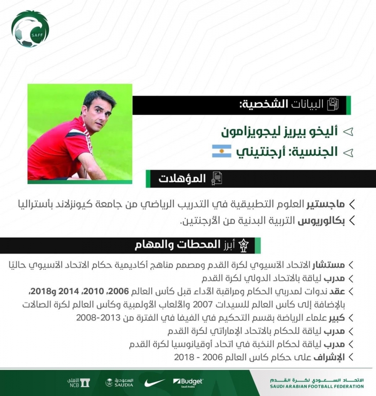 ولفت البيان إلى أليخو بيريز يمتلك سجلًا حافلًا من خلال الإشراف على حكام كأس العالم منذ نسخة 2006 وحتى آخر مشاركة “مونديال 2018” بالإضافة إلى العديد من البطولات الدولية، كذلك عمله مدربًا للياقة للحكام في عدد من الاتحادات الأهلية.