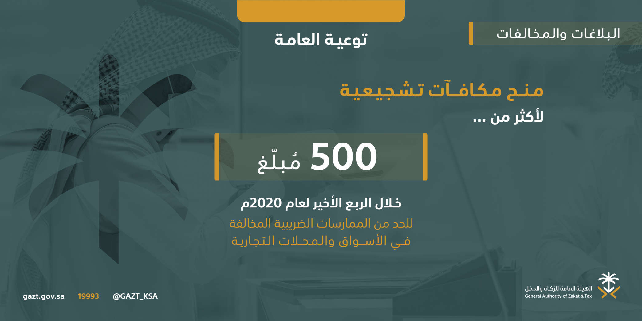 وكشفت هيئة الزكاة والدخل عن أنها قد صرفت مكافآتٍ تشجيعية لـ 529 مُبلِّغ في الفترة من شهر سبتمبر الماضي وحتى تاريخه، وذلك بعد التأكد من صحة البلاغات التي قدموها حول عددٍ من المخالفات الضريبية، وانطباق شروط استحقاق المكافأة، حيث بينت الهيئة بأن مخالفة عدم وجود الرقم الضريبي على الفاتورة كانت أكثر مخالفة تم الإبلاغ عنها من قبل المستهلكين وذلك بـ 128 بلاغاً، تليها مخالفة عدم تحصيل ضريبة القيمة المضافة بـ 82 بلاغاً، وتحصيل ضريبة أقل من النسبة الأساسية بـ 75 بلاغا.