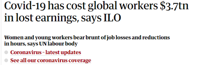 كلفت النتائج الاقتصادية السيئة لفيروس كورونا، العمال في جميع أنحاء العالم خسائر تقدر بـ3.7 تريليون دولار (2.7 تريليون جنيه إسترليني) من الأرباح، بعد أن قضى الوباء على أربعة أضعاف عدد ساعات العمل المفقودة في الأزمة المالية لعام 2008، وفقًا لهيئة العمل التابعة للأمم المتحدة.