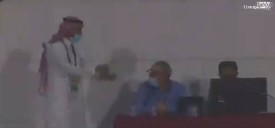 وجه الخبير التحكيمي محمد فودة اللوم لـ رئيس لجنة الحكام، الإسباني فيرناندو تريساكو، بعد حديثه مع رئيس النصر صفوان السويكت خلال استراحة الشوط الأول في مباراة العالمي والاتحاد، التي أُقيمت مساء الأحد في دوري الأمير محمد بن سلمان للمحترفين.