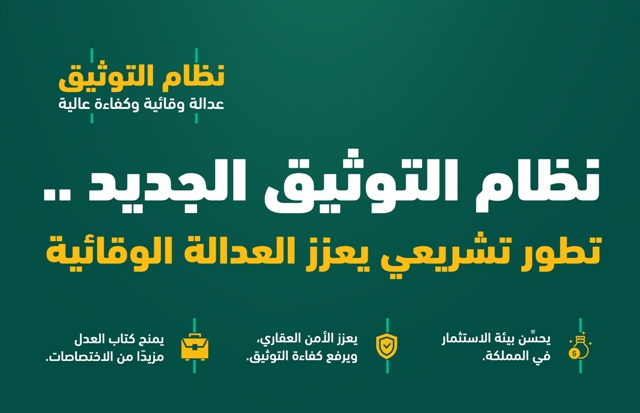 وتضمن نظام التوثيق نقل عددٍ من الاختصاصات المتصلة بالإقرارات التي لدى المحاكم إلى كتابات العدل، بما يسهم في تحسين تجربة المستفيد ورفع نسبة الرضا عن الخدمات التوثيقية من خلال تقديم خدمات عدلية توثيقية متكاملة ومؤتمتة تشمل جميع الأعمال الإدارية والمعلوماتية الداعمة لمنظومة التوثيق وتقديم الخدمات التوثيقية إلكترونيًا دون حاجة المستفيدين لزيارة المرافق العدلية، إضافة إلى تحفيز النمو الاقتصادي من خلال بناء منصات خدمات نوعية، وتعزيز الأمن العقاري ورفع مستويات الشراكة مع القطاع الخاص، ورفع تصنيف المملكة في مؤشر تسجيل الملكية.