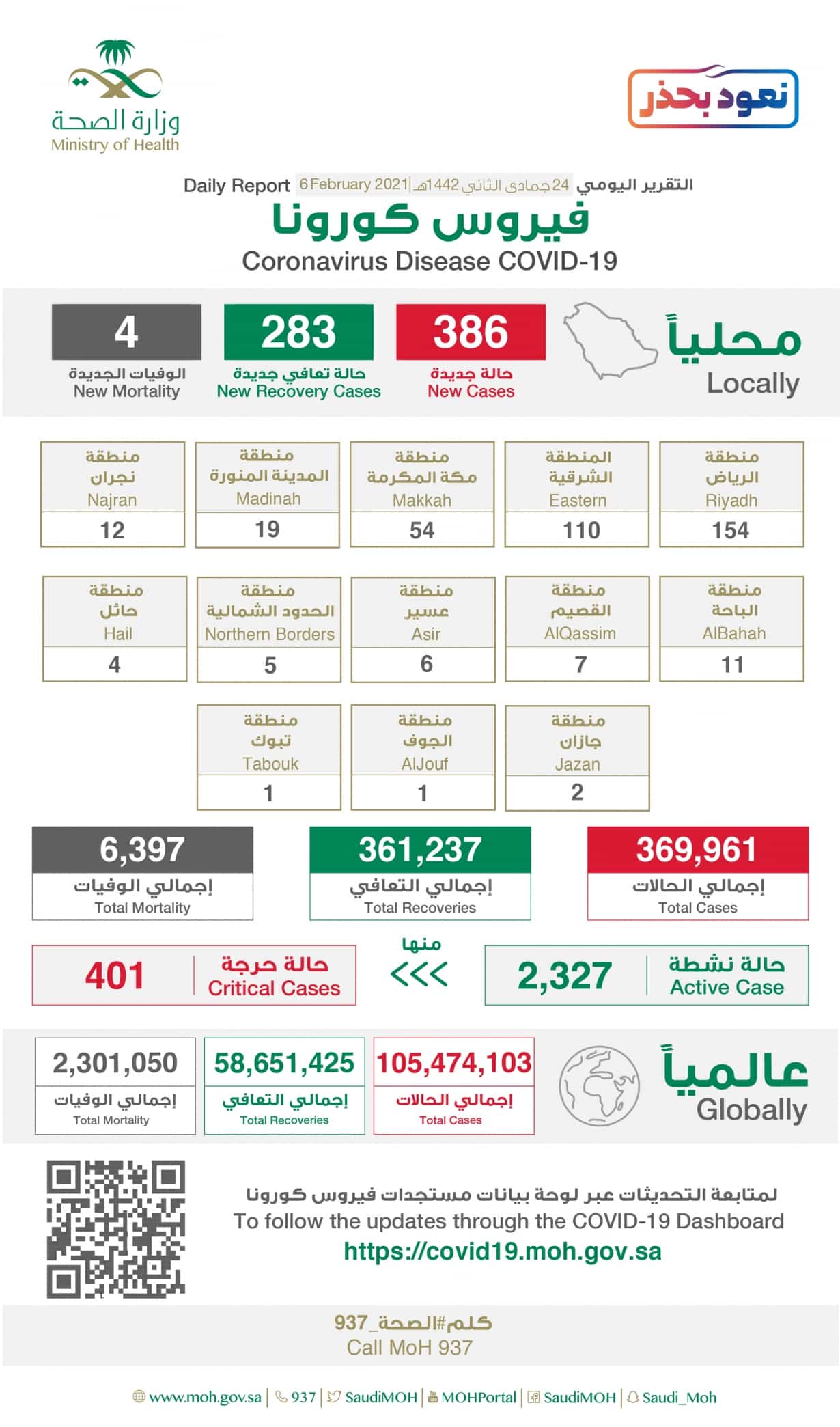 وبذلك يصل عدد إجمالي المصابين بفيروس كورونا في المملكة إلى (369961) حالة، توفي منهم (6397) حالة.
