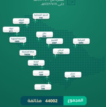 وسجلت منطقة الرياض وفق إحصائية نشرها حساب وزارة الداخلية العدد الأعلى بواقع بـ(17851)، تلتها منطقة مكة المكرمة بـ(10656)، ثم المنطقة الشرقية بـ(5095)، ومنطقة القصيم بـ(2387)، ومنطقة المدينة المنورة بـ(1899)، ومنطقة الجوف بـ(1327)، ومنطقة الباحة بـ(1075)، ومنطقة عسير بـ(939)، ومنطقة حائل بـ(896)، ومنطقة الحدود الشمالية بـ(742)، ومنطقة تبوك بـ(611)، ومنطقة جازان بـ(346)، ومنطقة نجران بـ(178).