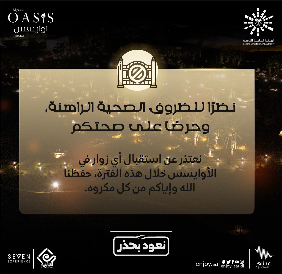 جاء ذلك في تغريدة لفعالية “عيشها” على موقع تويتر، صباح اليوم، جاء فيها: نعتذر عن استقبال الزوار في اوايسس الرياض ابتداءً من اليوم الخميس، نظرًا للظروف الصحية الراهنة وحرصًا على صحتكم”.