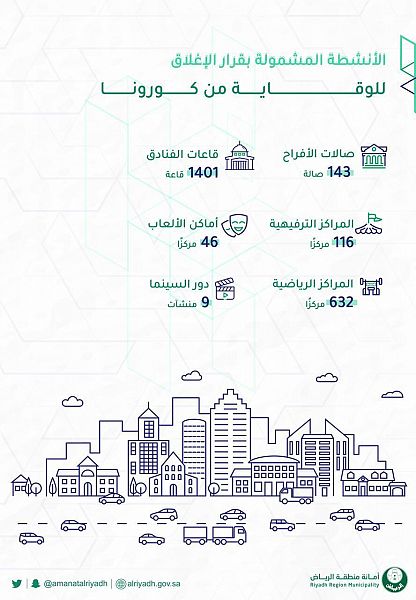 وأشارت الأمانة إلى أن 6 أنشطة تجارية ستوصد أبوابها امتثالاً للقرارات الصارمة، والهادفة إلى الحد من التجمعات ومنع انتقال العدوى بين السكان، ومن بين تلك الأنشطة، 143 صالة أفراح، 1401 قاعة فندقية، 116 مركزًا ترفيهيًا، 46 موقعًا للألعاب، 632 مركزًا رياضيًا، و9 دور للسينما.