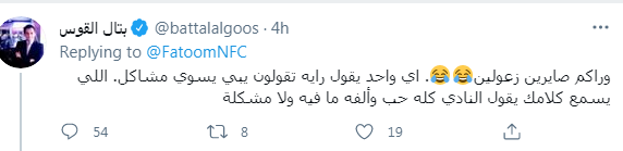 فقال بتال القوس ردًّا عليها: “وراكم صايرين زعولين، أي واحد يقول رأيه، تقولون يبي يسوي مشاكل، اللي يسمع كلامك، يقول النادي كله حب وألفة، وما فيه ولا مشكلة”.