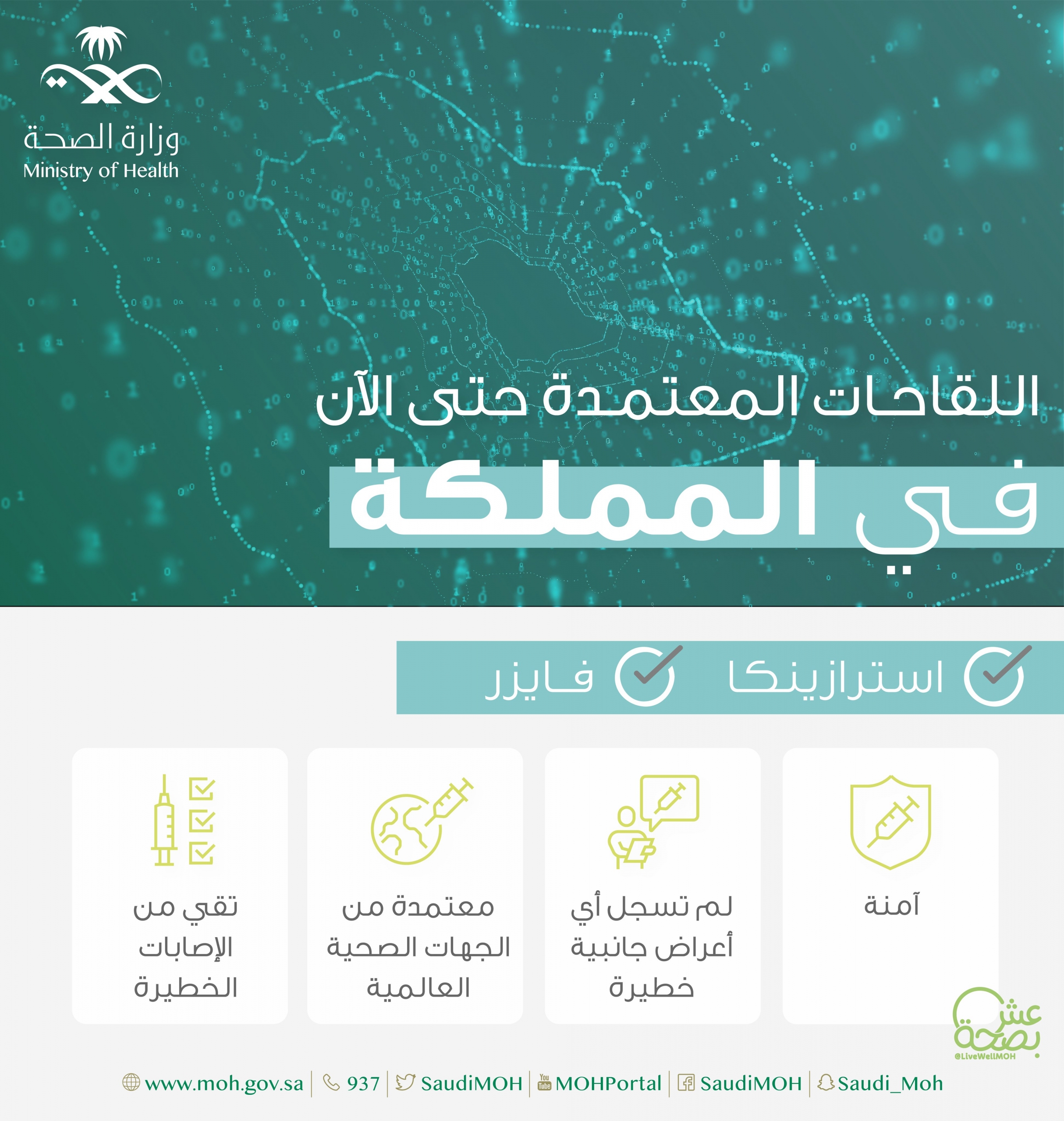وقالت الصحة عبر إنفوجراف لها: إن اللقاحات المعتمدة في المملكة توفر العديد من المزايا منها ما يلي: