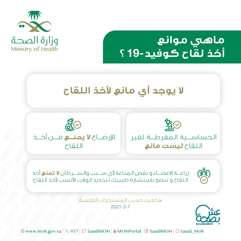 وقالت الصحة عبر حسابها بموقع تويتر: إن زراعة الأعضاء ونقص المناعة لأي سبب والسرطان أسباب لا تمنع أخذ اللقاح، لكن يجب استشارة الطبيب لتحديد الوقت الأنسب لأخذ اللقاح.
