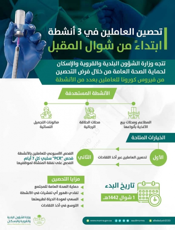 وكانت وزارة الشؤون البلدية والقروية والإسكان، أعلنت أنه حمايةً للصحة العامة سيتم فرض تحصين العاملين في 3 أنشطة ابتداءً من غرة شوال المقبل أو فحص (PCR) أسبوعيًا للعاملين في أنشطة المطاعم ومحلات بيع الأغذية بأنواعها، ومحلات الحلاقة الرجالية، إضافة إلى صالونات التجميل النسائية.