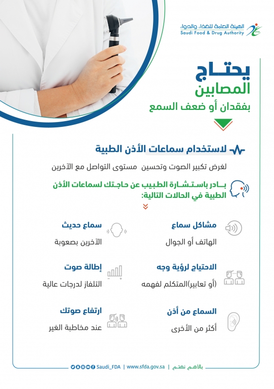 قالت الهيئة العامة للغذاء والدواء: إن هناك حالات يحتاج فيها المصابون بفُقدان السمع أو ضعفه إلى استخدام سماعات الأذن الطبية.