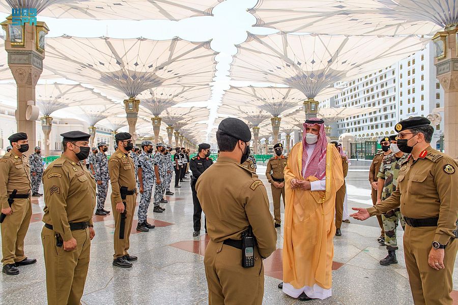 ووقف على أعمال وكالة شؤون المسجد النبوي ومُختلف خدماتها المُقدمة لخدمة قاصدي المسجد، كما اطلع خلال جولة عامة بساحات وأروقة المسجد النبوي على جهود وأعمال قوة أمن المسجد، المتمثلة في تطبيق الإجراءات المعمول بها من حيث اقتصار الدخول للمسجد على الفئات المُحصنة وفقاً لما هو مُطبق منذ حلول الشهر الكريم.
