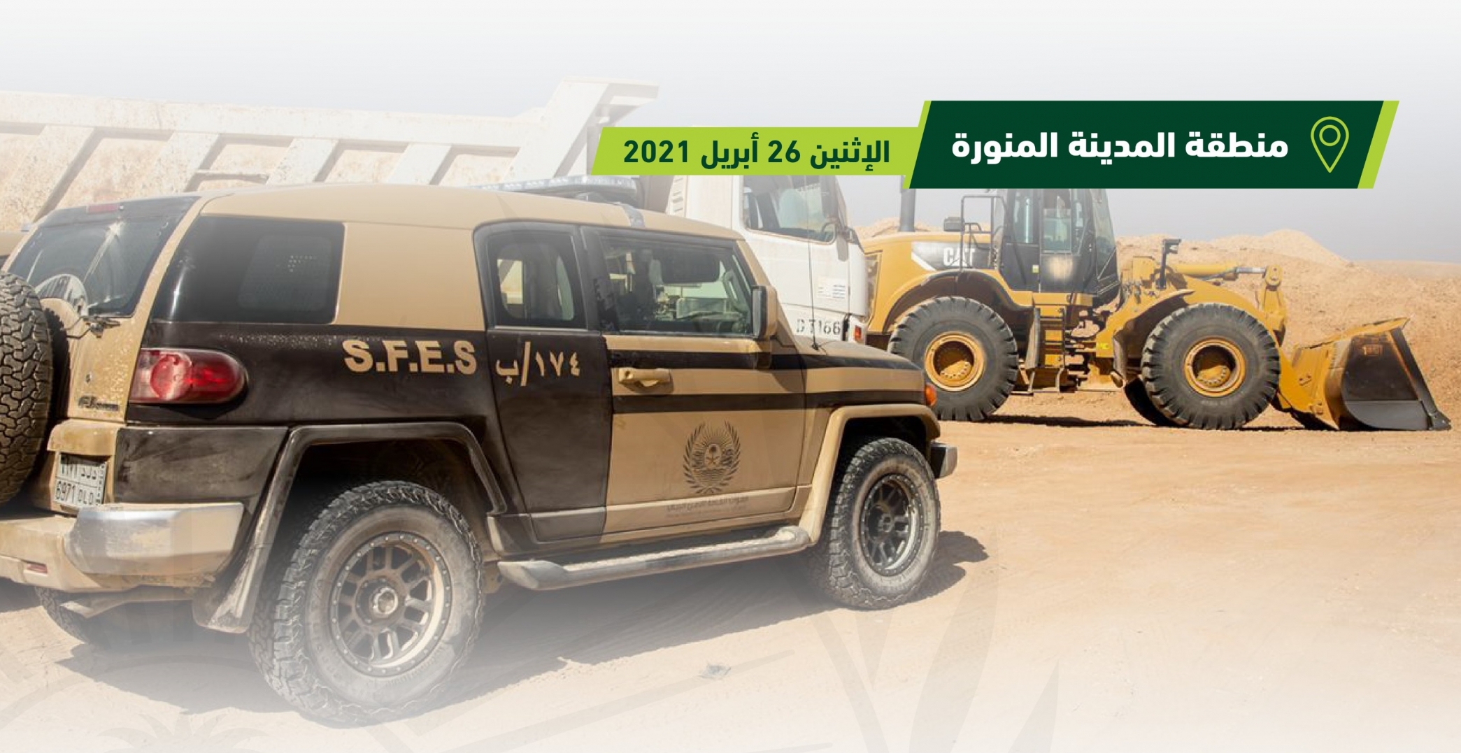 ضبطت القوات الخاصة لـ الأمن البيئي (4) مخالفين لنظام البيئة يقومون بنقل الرمال وتجريف التربة دون تصريح في منطقة المدينة المنورة.