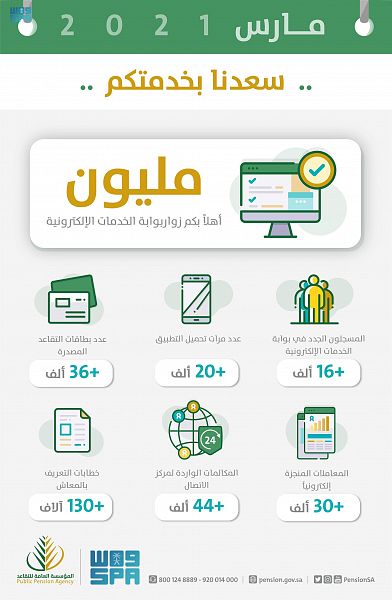 أصدرت المؤسسة العامة للتقاعد، خلال شهر مارس الماضي إحصاءاتها الشهرية معلنة عن وصول عدد زوار البوابة الإلكترونية لمليون زائر وانضمام أكثر من 16 ألف مسجل جديد لبوابة الخدمات الإلكترونية.