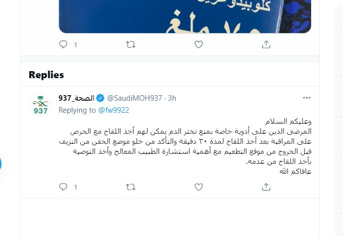 وردت الصحة على سؤال من أحد الأشخاص تتلقى أمه أحد أدوية سيولة الدم بالقول: إن المرضى الذين على أدوية خاصة بمنع تخثر الدم يمكن لهم أخذ اللقاح مع الحرص على المراقبة بعد أخذ اللقاح لمدة ٣٠ دقيقة والتأكد من خلو موضع الحقن من النزيف قبل الخروج من موقع التطعيم مع أهمية استشارة الطبيب المعالج وأخذ التوصية بأخذ اللقاح من عدمه.