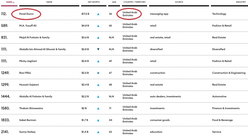 وقدرت فوربس ثروة مؤسس تطبيق تليغرام، رجل الأعمال الروسي بافيل دوروف، بنحو 17.2 مليار دولار.