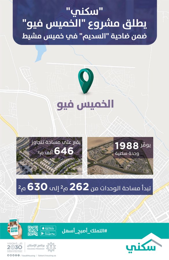 وأشار “سكني” إلى أن مشروع “الخميس فيو” السكني يقع على مساحة تتجاوز 646 ألف م2، ويضم 1988 وحدة سكنية بأربعة نماذج ضمن تصاميم عصرية تقع بالقرب من مواقع الخدمات الحيوية لتلبية احتياجات الأسرة السعودية، وتبدأ مساحات الوحدات من 262م2 إلى 630م2 للوحدة وبأسعار تبدأ من 619 ألف ريال، ويأتي مشروع “الخميس فيو” امتداداً لنحو 4 مشاريع سكنية للوحدات تحت الإنشاء يتيحها “سكني” لمستفيديه في منطقة عسير توفر 4444 وحدة سكنية متنوعة ما بين شقق وفلل وتاون هاوس، بهدف تسهيل تملك الأسر السعودية وزيادة نسبة التملك إلى 70% بحلول 2030 ضمن مستهدفات برنامج الإسكان – أحد برامج رؤية المملكة 2030-.