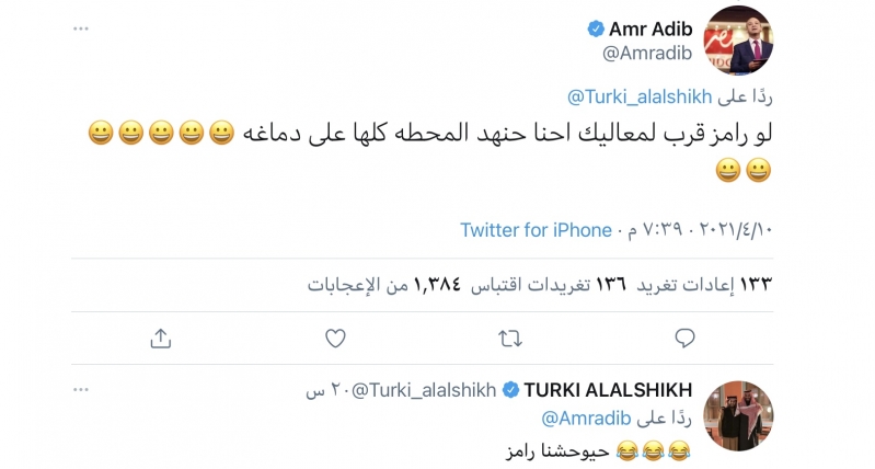 من ناحيته علق الإعلامي المصري عمرو أديب على التغريدة بالقول: “لو رامز قرب لمعاليك إحنا حنهد المحطة كلها على دماغه”، ورد رئيس هيئة الترفيه قائلًا: “حيوحشنا رامز”.