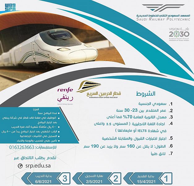بدأ المعهد السعودي التقني للخطوط الحديدية – سرب – اليوم الخميس القبول في برنامج قائد قطار الحرمين السريع الذي يستمر لمدة عام وينتهي بالعمل في شركة رينفي – السعودية، أحد الشركات المتحالفة لتشغيل مشروع قطار الحرمين السريع.