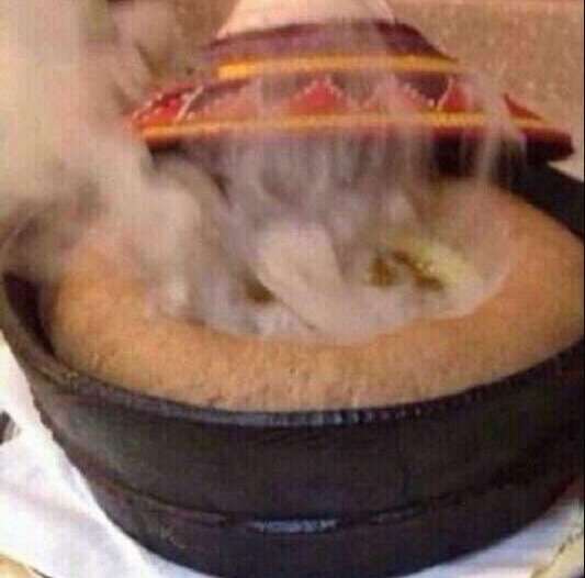 في هذه الأثناء نكون قد وضعنا الحجر المغسول والمنشف على النار، ثم نضع في وعاء ربع كأس دقيق وعندما تبدأ الزبدة بإظهار رغاوٍ على السطح والحجر قد أصبح ساخنًا جدًا نضع الحجر في وعاء الدقيق ونقلبه حتى نلاحظ ظهور دخان من الدقيق.