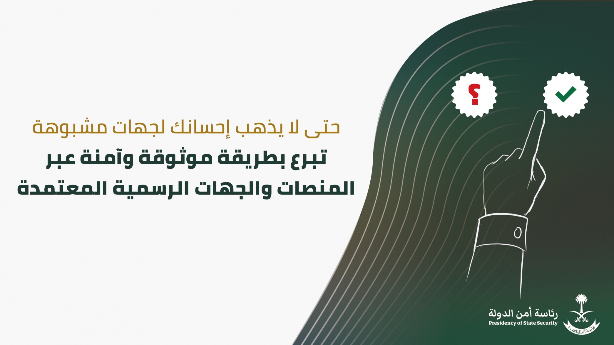 أكدت رئاسة أمن الدولة أن التبرع عبر القنوات المصرح لها؛ يُنمّي العمل الخيري والإنساني داخل المملكة.
