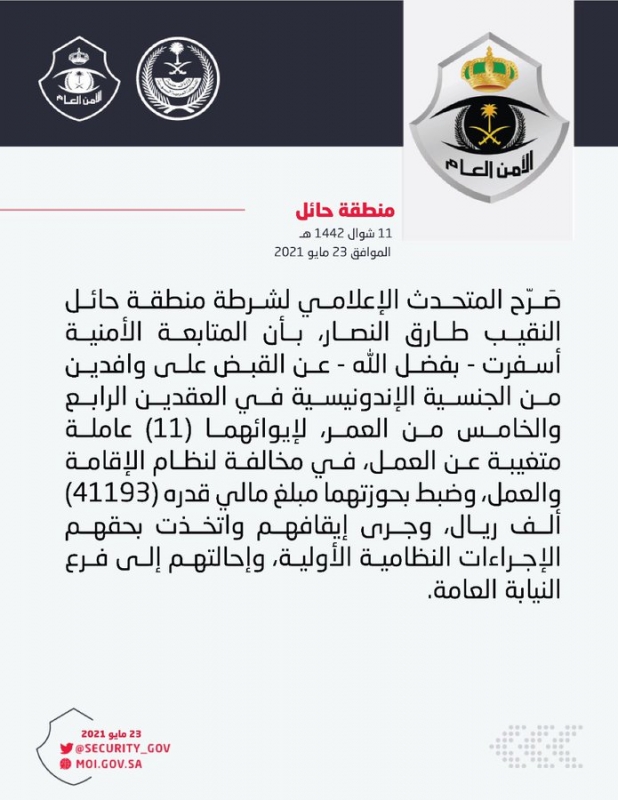 وصَرّح المتحدث الإعلامي لشرطة منطقة حائل النقيب طارق النصار، بأن المتابعة الأمنية أسفرت – بفضل الله – عن القبض على وافدين من الجنسية الإندونيسية في العقدين الرابع والخامس من العمر، لإيوائهما (11) عاملة متغيبة عن العمل، في مخالفة لنظام الإقامة والعمل، وضبط بحوزتهما مبلغ مالي قدره (41193) ألف ريال.