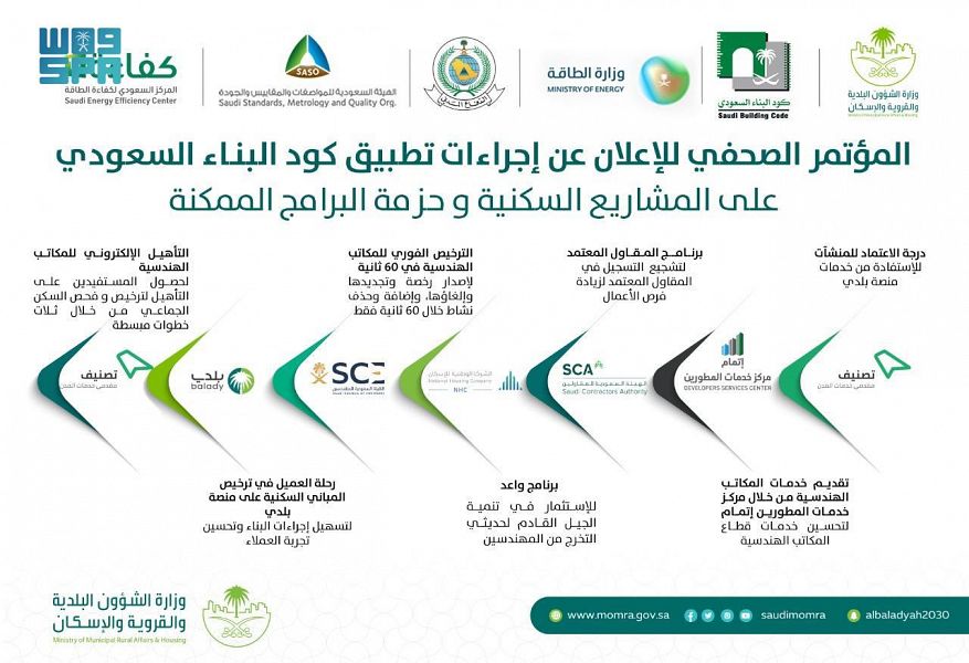 تستعرض وزارة الشؤون البلدية والقروية والإسكان، غدًا الثلاثاء في مؤتمر صحافي بالرياض إجراءات تطبيق كود البناء السعودي على المشاريع السكنية، والبرامج الممكنة من تحقيق مجموعة الاشتراطات والمتطلبات وما يتبعها من لوائح تنفيذية وملاحق تتعلق بالبناء والتشييد.