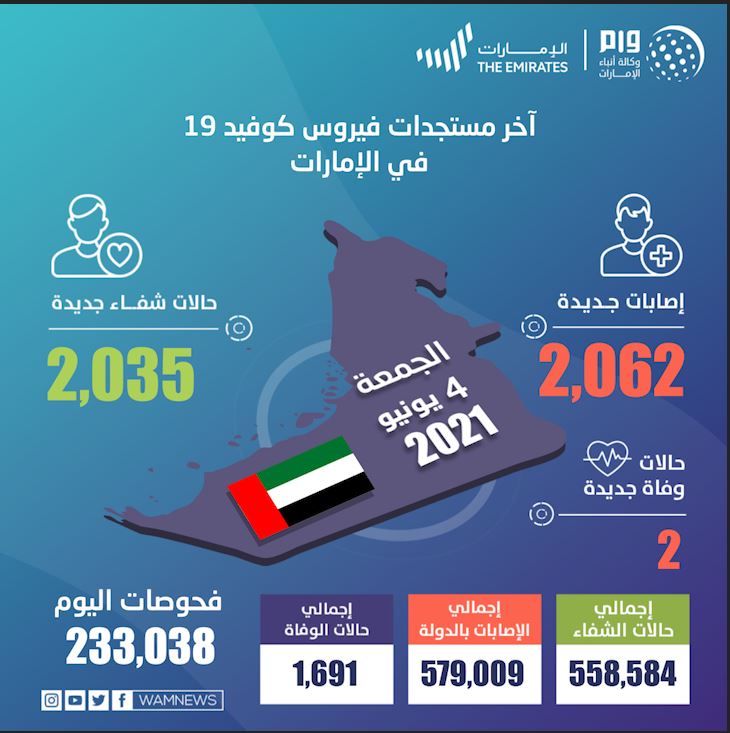 وبذلك يبلغ مجموع الحالات المسجلة 579,009 حالات، كما أعلنت الوزارة عن وفاة حالتي مصابتين وذلك من تداعيات الإصابة بفيروس كورونا المستجد، وبذلك يبلغ عدد الوفيات في الدولة 1,691 حالة.
