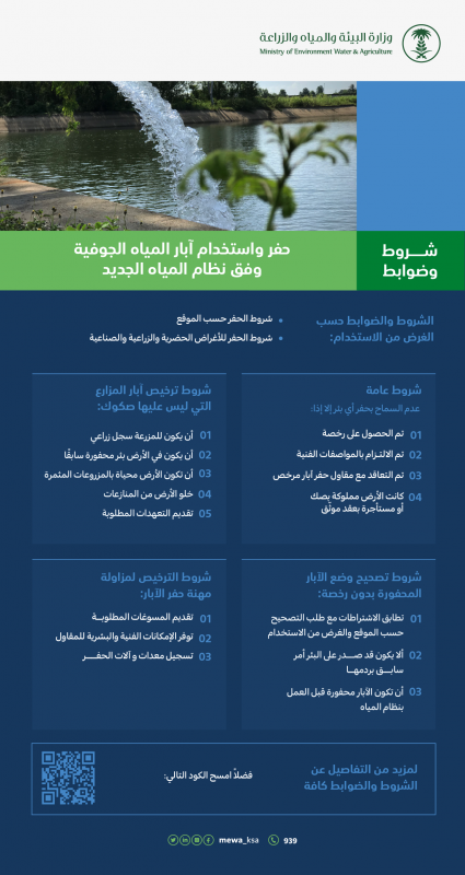 إلى هذا، يمكنكم الاطلاع على كافة التفاصيل حول شروط وضوابط حفر واستخدام آبار المياه الجوفية، ومزاولة العمل بمهنة حفر الآبار، من خلال زيارة موقع الوزارة الإلكتروني، والضغط على الرابط التالي: https://bit.ly/34ehAYw.