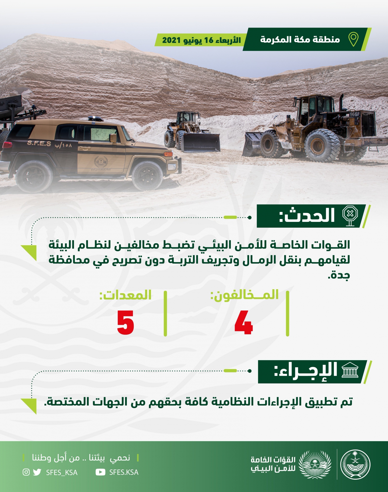 ضبطت القوات الخاصة للأمن البيئي (4) مخالفين لنظام البيئة لقيامهم بنقل الرمال وتجريف التربة دون تصريح في محافظة جدة.
