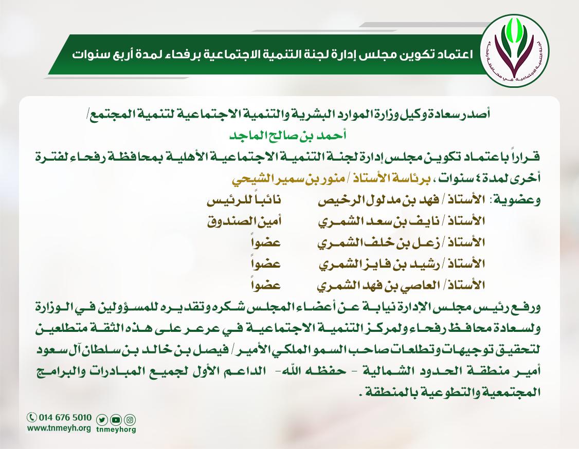 أصدر وكيل وزارة الموارد البشرية والتنمية الاجتماعية لتنمية المجتمع أحمد بن صالح الماجد قرارًا باعتماد تشكيل مجلس إدارة لجنة التنمية الاجتماعية الأهلية بمحافظة رفحاء لفترة أخرى لمدة 4 سنوات، برئاسة منور بن سمير الشيحي.