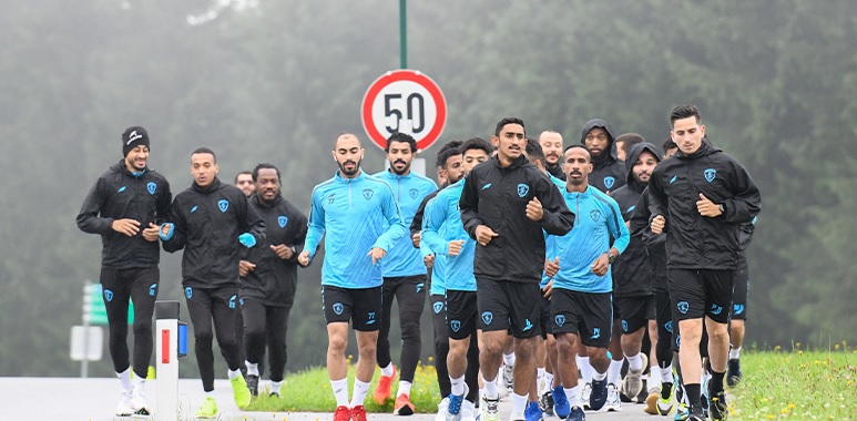 وأُقيمت تدريبات النموذجي اليوم على فترتين صباحية ومسائية، أُجريت الأولى في محيط مقر الإقامة بين الجبال والمرتفعات وسط حماس وتفاعل من اللاعبين الذين قطعوا مسافة قرابة 14 كم.