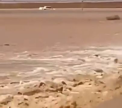 وأظهر مقطع فيديو متداول لحظة جريان السيول التي أدت إلى تعطل حركة السير على الطريق.
