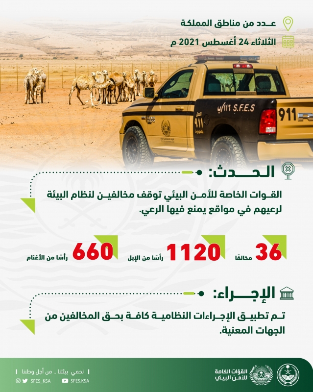أوقفت القوات الخاصة لـ الأمن البيئي (36) مخالفًا لنظام البيئة، منهم (16) مواطنًا و(20) مقيمًا، من الجنسية السودانية، ارتكبوا مخالفات رعي (1120) رأسًا من الإبل و(660) رأسًا من الأغنام في أماكن يمنع فيها الرعي في عدد من مناطق المملكة.