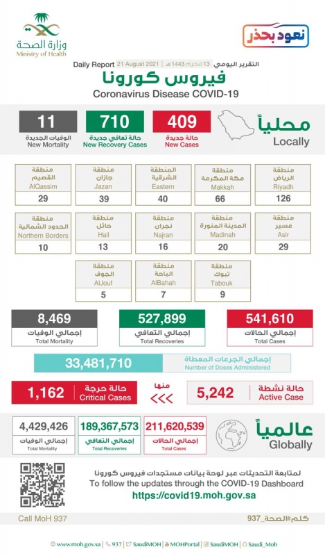 كشفت وزارة الصحة عن أرقام في المملكة والتي تجاوزت 33 مليونًا و481 ألفًا و710 جرعات عبر أكثر من (587) موقعًا للتطعيم في مناطق المملكة كافة.