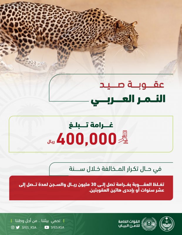 حذرت القوات الخاصة للأمن البيئي من صيد النمر العربي مؤكدة أن العقوبة قد تصل إلى 30 مليون ريال إذا تكررت الجريمة خلال نفس العام.